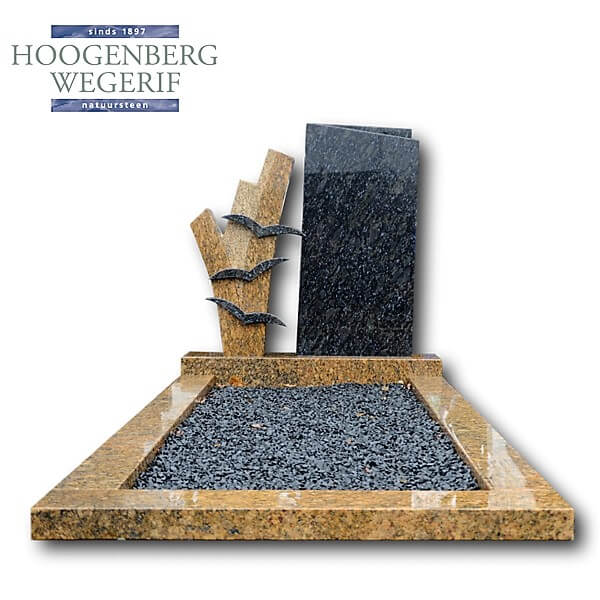 Opvallend zijn de drie vogels die sierlijk uit de steen lijken op te stijgen, een krachtig symbool van vrijheid en de overgang naar een andere dimensie. Het liggende deel is omlijst met hetzelfde warme graniet en gevuld met donkere sierstenen, wat zorgt voor een mooi contrast en een verzorgde uitstraling.