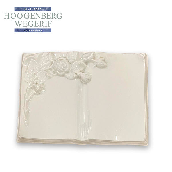 Dit delicate gedenkteken in de vorm van een open boek is vervaardigd uit porselein, wat het een verfijnde en elegante uitstraling geeft. Het boek is prachtig versierd met een bloemenmotief aan de linkerpagina, een symbool van liefde en herinneringen. De combinatie van het strakke ontwerp en het gedetailleerde bloemenpatroon maakt dit monument een subtiele, maar betekenisvolle manier om de herinnering aan een dierbare te vereeuwigen.