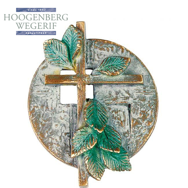Dit bronzen ornament combineert het klassieke kruis met natuurlijke elementen, wat zorgt voor een uniek en betekenisvol ontwerp. De groene bladeren die langs het kruis groeien, symboliseren leven, groei en verbondenheid. De ronde achtergrond met subtiele structuren geeft het geheel extra diepte en karakter.