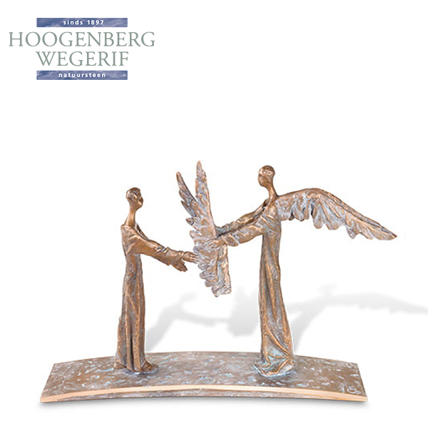 De vloeiende lijnen van de figuren en de gedetailleerde vleugels creëren een balans tussen beweging en sereniteit, terwijl de bronskleur het werk een tijdloze en warme uitstraling geeft. Dit beeld is dan ook niet alleen geschikt voor herdenkingen, maar ook als een mooi kunstobject in huis dat symboliseert wat we soms moeilijk onder woorden kunnen brengen: de kracht van afscheid, liefde en verbondenheid.