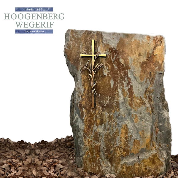 Het warme brons steekt prachtig af tegen de robuuste natuursteen, waardoor het geheel zowel rustiek als elegant oogt. Dit ornament is een waardevolle toevoeging aan een gedenkplek, en brengt een gevoel van troost en verbondenheid over. Dankzij de duurzame kwaliteit van het brons blijft het kruis jarenlang mooi, ongeacht de weersinvloeden.