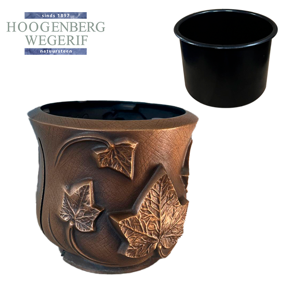 Deze elegante bronzen plantenvaas is voorzien van een verfijnd klimopmotief, dat symbool staat voor eeuwige verbondenheid en herinnering. De gedetailleerde bladeren en de warme bronskleur geven de vaas een tijdloze uitstraling, waardoor hij een prachtige toevoeging is aan een gedenkplek of tuin.
