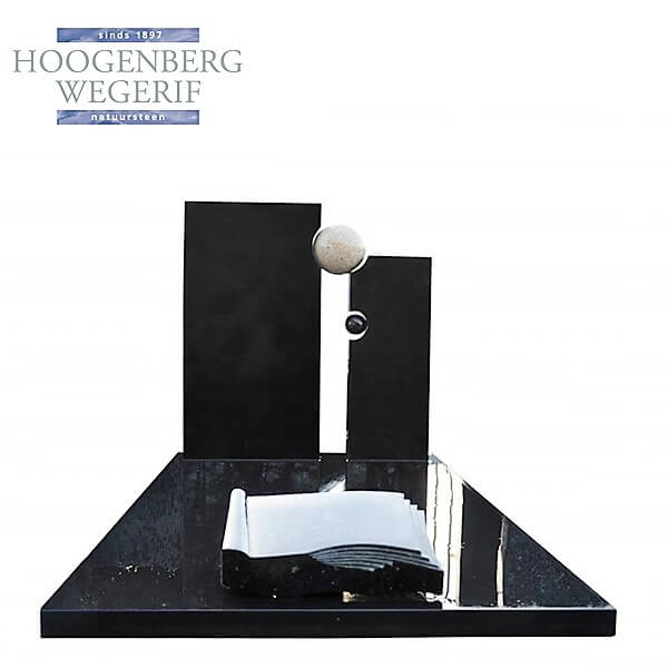 Een opvallend element is de abstracte weergave van een open boek in de basis, uitgevoerd in gebogen zwart graniet. Boven dit boek zweven een witte bol en een kleine zwarte bol, die symbool kunnen staan voor de overgang tussen leven en dood of voor een spirituele reis. Deze elementen geven het monument een luchtige en toch diepe uitstraling.
