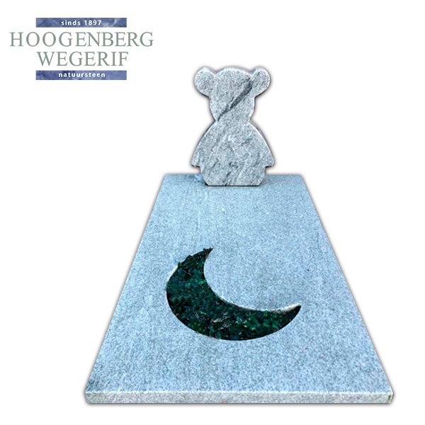 Dit bijzondere kindermonument is met zorg en aandacht ontworpen om een liefdevolle en troostrijke herinneringsplek te creëren. Gemaakt van hoogwaardig Viscount White natuursteen straalt het een zachte en serene sfeer uit. De beer-vormige gedenksteen symboliseert warmte en geborgenheid, terwijl de halve maan, gevuld met groene glasstenen, een dromerige en rustgevende uitstraling geeft.