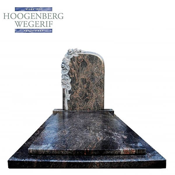 Dit elegante grafmonument straalt warmte en rust uit. De diepe bruintinten van het natuursteen geven het een tijdloze uitstraling, terwijl de verfijnde rozenrand aan de zijkant van de staande steen een sierlijk en persoonlijk accent toevoegt. Deze subtiele bloemenrand symboliseert liefde, herinnering en verbondenheid, waardoor het monument een zachte en troostrijke uitstraling krijgt.