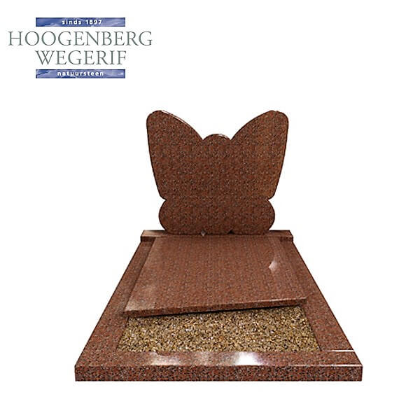 Dit grafmonument heeft een zachte en symbolische uitstraling door de vlindervormige letterplaat. De vlinder staat voor transformatie, vrijheid en de vergankelijkheid van het leven, wat dit monument een bijzondere en betekenisvolle keuze maakt. Het roodbruine graniet, met zijn warme kleurnuances en subtiele korrelstructuur, geeft het geheel een natuurlijke en rustgevende uitstraling.