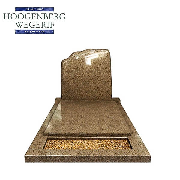 Het liggende deel van het monument is zorgvuldig vormgegeven, met een subtiel verhoogde dekplaat die het geheel een gelaagd effect geeft. De omranding omsluit een open vak gevuld met natuursteengrit, wat ruimte biedt voor een persoonlijke toevoeging zoals een plant of een symbolisch element.