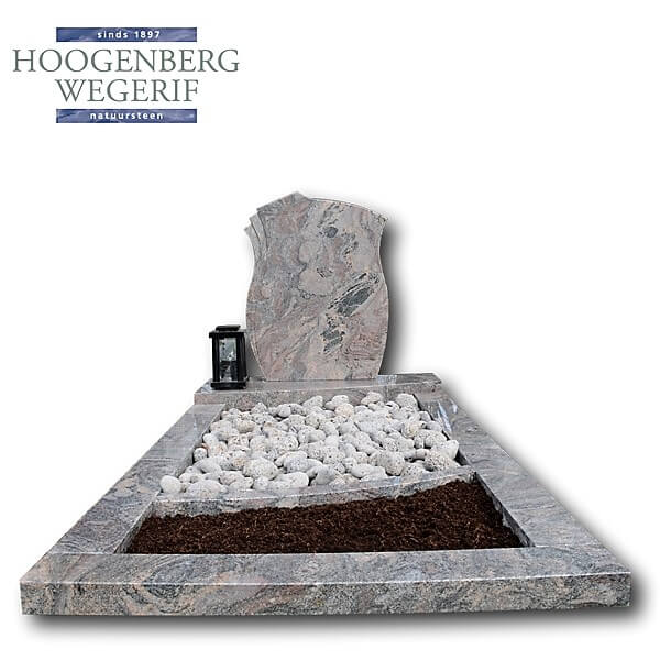 Dit grafmonument van Hoogenberg-Wegerif is een elegant ontwerp dat de rust en sereniteit van de natuur weerspiegelt. De grafsteen heeft een organische vorm, waarbij de rand subtiel omhoog buigt, wat het monument een vloeiende, bijna natuurlijke uitstraling geeft. Het gebruik van gemarmerd graniet zorgt voor een verfijnde en tijdloze uitstraling, terwijl de zachte patronen in de steen het monument een rustige, maar krachtige aanwezigheid geven.