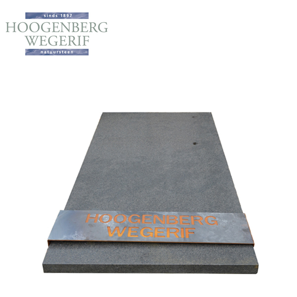 Een opvallend element is de metalen strip met uitgesneden belettering. De warme, roestkleurige tint voegt een subtiel industrieel accent toe en zorgt voor een uniek contrast met het grijze natuursteen. Dit moderne detail geeft het ontwerp niet alleen karakter, maar biedt ook ruimte voor een persoonlijke inscriptie of symboliek.