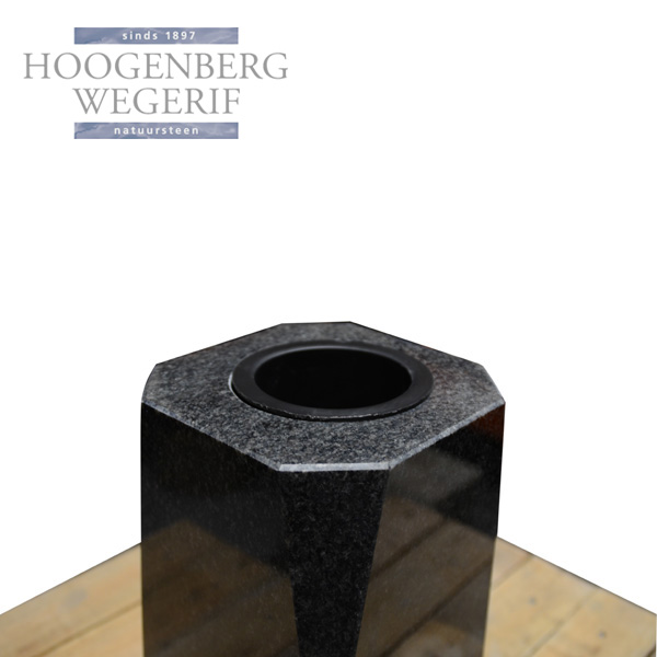 Door het gebruik van Impala-graniet krijgt de vaas een elegante en verfijnde uitstraling, die tegelijkertijd duurzaam en weerbestendig is. De vaas is ideaal voor het plaatsen van bloemen of andere herdenkingssymbolen, waarbij de robuuste vorm en het glanzende oppervlak de uitstraling van het monument versterken.