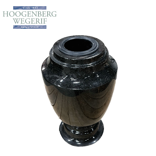 Deze grafvaas is vervaardigd uit hoogwaardig graniet, wat zorgt voor zowel duurzaamheid als een luxe uitstraling. Het gepolijste oppervlak van het graniet reflecteert het licht prachtig, waardoor de vaas een elegante en moderne uitstraling heeft.