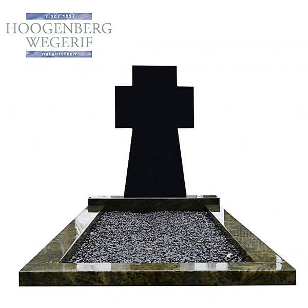 Dit grafmonument van Hoogenberg-Wegerif heeft een krachtige en symbolische uitstraling, waarbij de klassieke vorm van een kruis gecombineerd wordt met moderne elementen. Het zwarte kruis steekt duidelijk af tegen de donkere groene basis, wat zorgt voor een prachtig contrast. Het glanzende oppervlak van het kruis reflecteert het omringende licht en voegt een serene en respectvolle dimensie toe aan het ontwerp.