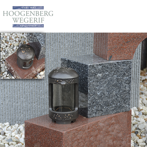 Dankzij het compacte formaat en de neutrale bronstint past deze lantaarn moeiteloos bij diverse natuursteensoorten. Of hij nu op een grafmonument wordt geplaatst of geïntegreerd wordt in een groter herdenkingsontwerp, de warme uitstraling draagt bij aan een sfeervol eerbetoon.