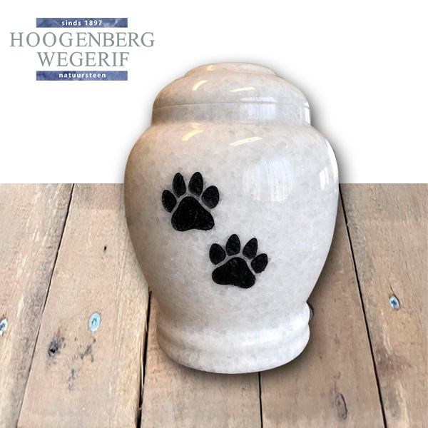 Deze urn is gemaakt van wit marmer met een lichte, zachte structuur. De zwarte pootafdrukken springen eruit en maken direct duidelijk voor wie dit bedoeld is: een dierbare viervoeter die voor altijd gemist wordt.
