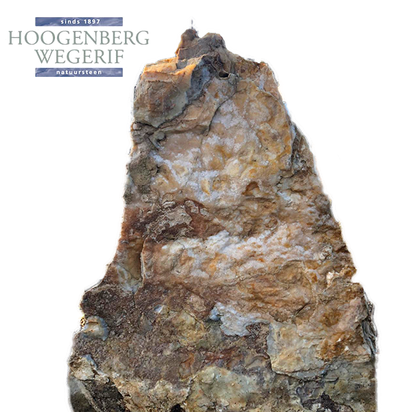 Dit unieke grafmonument is een prachtig stuk natuursteen met warme tinten van beige, bruin en goud. De ruwe, onbewerkte vorm en natuurlijke texturen geven het monument een pure en organische uitstraling, waardoor het een harmonieus geheel vormt met de omgeving.