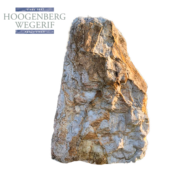 Dit unieke grafmonument is een prachtig natuurlijk gevormde steen met een combinatie van witte en aardse tinten. De ruwe textuur en onbewerkte randen geven het monument een robuuste, authentieke uitstraling, waardoor het een natuurlijke harmonie met de omgeving behoudt.