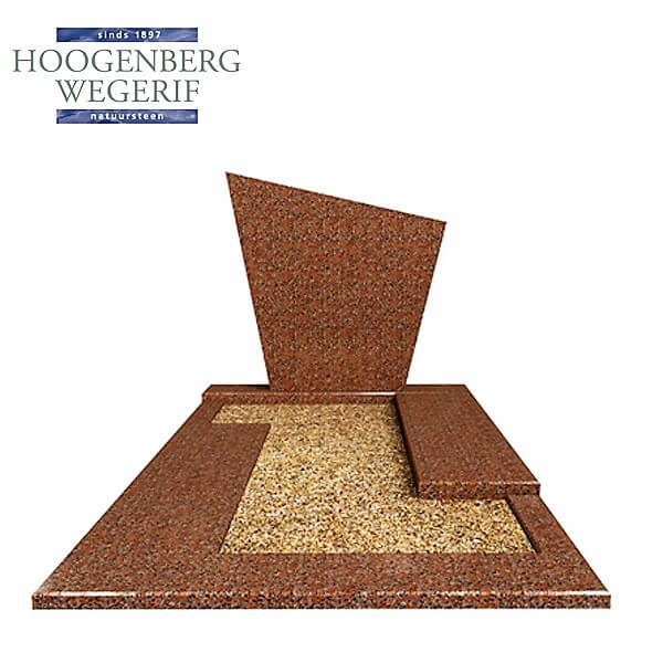 Dit grafmonument heeft een modern en geometrisch ontwerp met opvallende scherpe hoeken en een asymmetrische vormgeving. Het gebruik van oranje-rood graniet zorgt voor een warme en uitnodigende uitstraling, die tegelijk kracht en rust uitstraalt. De scherpe lijn van de bovenste zuil, die naar voren leunt, creëert een visueel dynamisch effect, terwijl de rechthoekige basis de stabiliteit en eenvoud van het monument onderstreept.