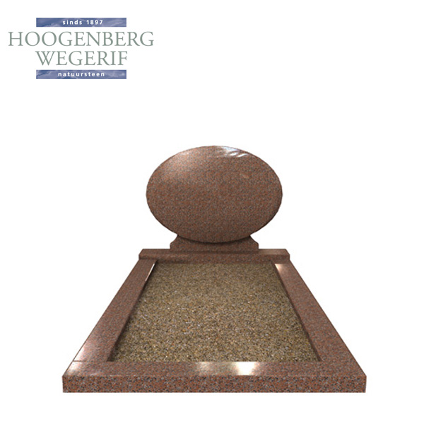 Dit grafmonument straalt zachtheid en harmonie uit door de ovale vorm van de letterplaat in combinatie met het warme roodbruine graniet. De gepolijste afwerking geeft de steen een subtiele glans, waardoor de natuurlijke kleurnuances prachtig naar voren komen. De ronde vorm van de letterplaat symboliseert oneindigheid en verbondenheid, wat dit monument een serene en tijdloze uitstraling geeft.
