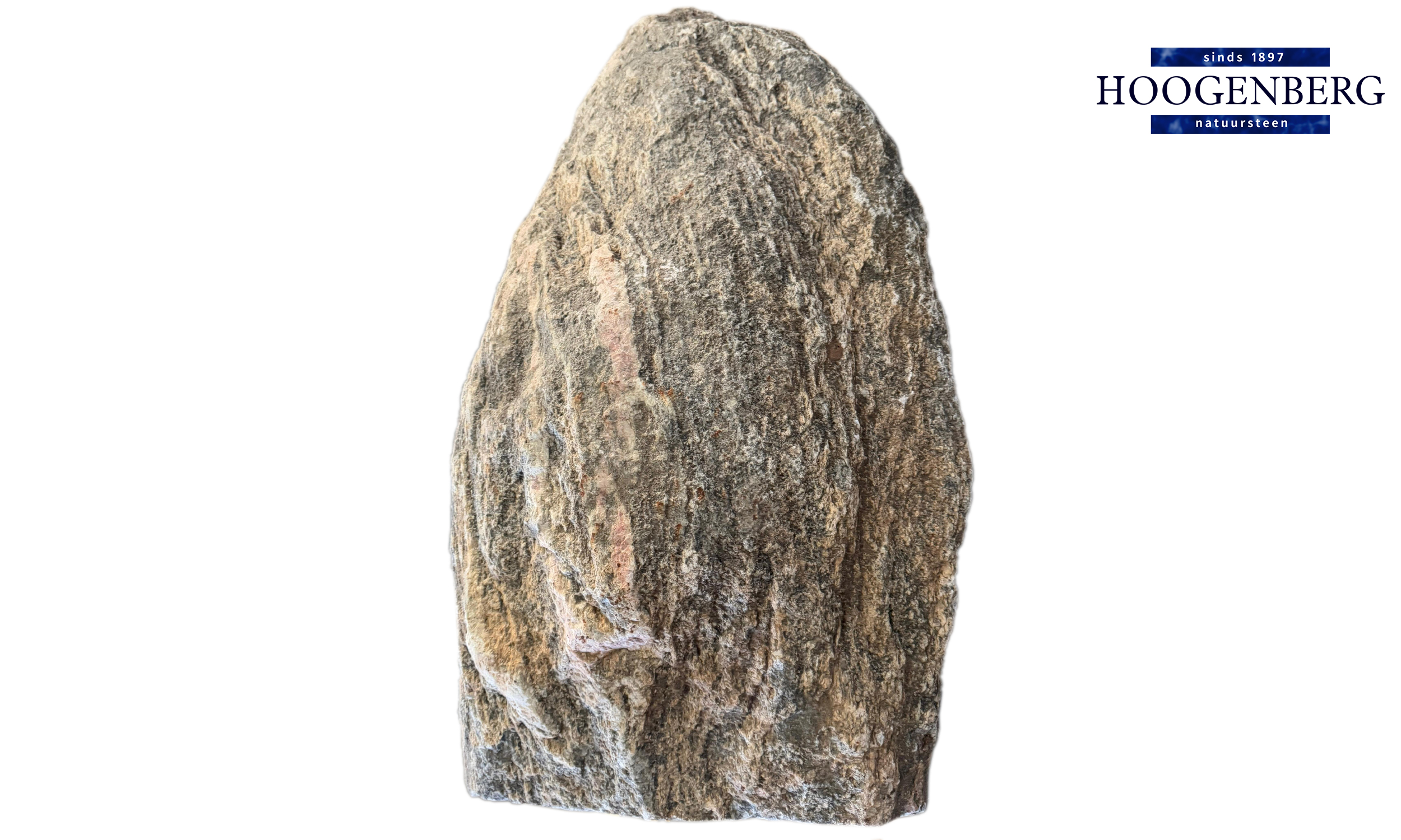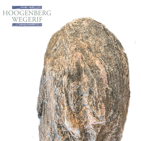 Dit unieke monument van Hoogenberg-Wegerif is een prachtig voorbeeld van de kracht en schoonheid van onbewerkt natuursteen. De organische vorm en de ruwe textuur geven de steen een pure, natuurlijke uitstraling. De kleurnuances variëren van warme rozetinten tot diepere aardse schakeringen, waardoor het monument een levendig en uniek karakter krijgt.