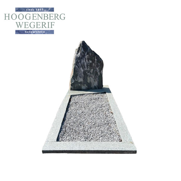 Het liggende gedeelte is gevuld met fijn grind in een rustig grijs palet, omlijst door een brede natuurstenen band. Dit zorgt voor een open en toegankelijke uitstraling, met volop ruimte voor symboliek, beplanting of persoonlijke accenten. De eenvoud van het ontwerp versterkt juist de emotionele waarde ervan.