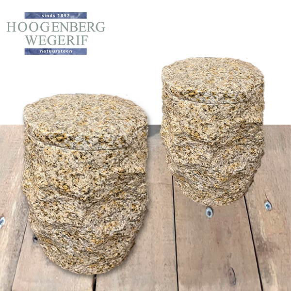 Deze urnen, vervaardigd uit ivoorkleurig graniet, combineren natuurlijke schoonheid met een robuuste uitstraling. De warme tinten, verrijkt met subtiele goud- en grijsaccenten, geven een rustgevend en tijdloos karakter. De ruw bewerkte buitenzijde zorgt voor een natuurlijke, organische vorm die doet denken aan ongerepte rotsen, waardoor de urnen naadloos opgaan in een natuurlijke omgeving.