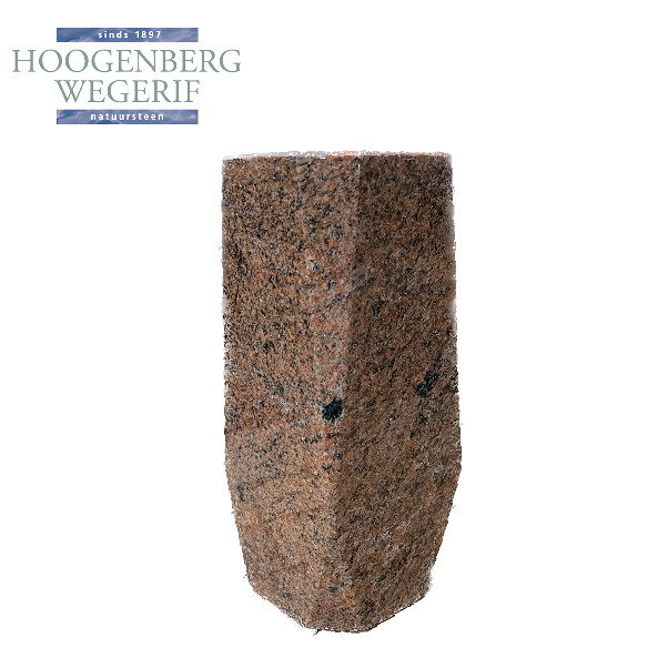 Deze stijlvolle grafbloemvaas is vervaardigd uit hoogwaardig graniet in een warme, rode tint, wat een elegante en tijdloze uitstraling biedt. Het ontwerp met scherpe, hoekige lijnen benadrukt de solide en robuuste kwaliteit van het natuursteen. De vaas is perfect voor het plaatsen van bloemen en het toevoegen van een verfijnde uitstraling aan een grafmonument.