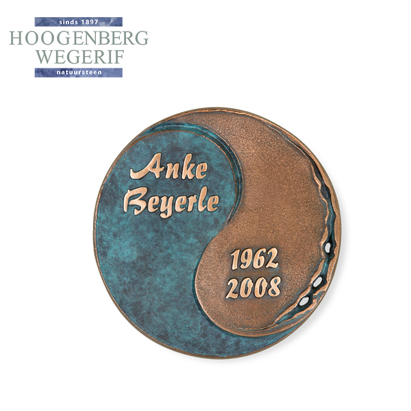 Deze ronde bronzen herdenkingsplaat combineert symboliek met verfijnd vakmanschap. Het yin-yang ontwerp staat voor balans, verbinding en eeuwige herinnering. De contrasterende afwerking in diepblauw patina en warm brons geeft het ornament een unieke uitstraling, waarbij de organische details langs de rand een subtiel speels effect toevoegen.