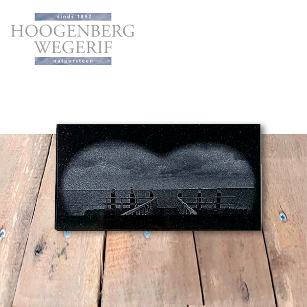 De subtiele gravure van de pier die zich uitstrekt naar de horizon symboliseert het afscheid en de verbondenheid met de herinneringen aan een geliefde. Het gebruik van zwart graniet geeft de plaat niet alleen een tijdloze uitstraling, maar zorgt ook voor een langdurige en stijlvolle aanwezigheid.