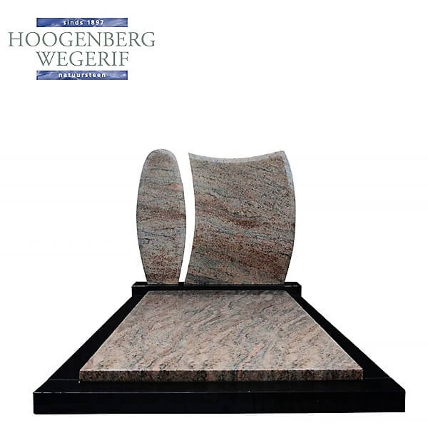 De zachte tinten van het graniet, gecombineerd met de glanzende afwerking, zorgen voor een verfijnde en tijdloze uitstraling. De strakke lijnen van de rechthoekige basis benadrukken de schoonheid van de gebogen bovenste delen, waardoor het ontwerp zowel rust als kracht uitstraalt. De combinatie van het donkere graniet en het lichtere, gebroken graniet maakt het monument visueel aantrekkelijk en zorgt voor een elegante en harmonieuze balans.