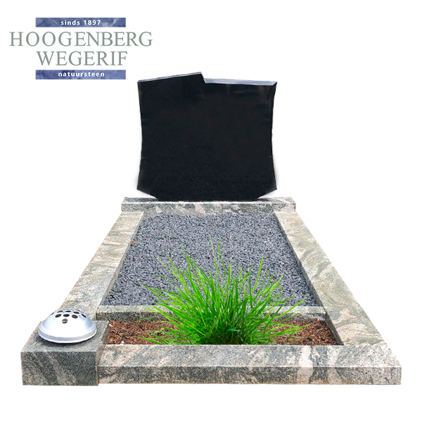 Dit grafmonument is een krachtig samenspel van materialen en kleuren. De letterplaat, uitgevoerd in diepzwart graniet, heeft een speelse en asymmetrische vorm die een uniek karakter toevoegt. De gepolijste afwerking zorgt ervoor dat opschriften prachtig tot hun recht komen en lang mooi blijven. Het contrast met de lichtere omranding versterkt de elegante uitstraling van het geheel.