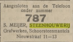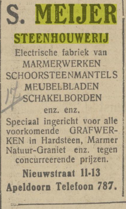 Bekijk afbeeldingIntussen werd de 3e generatie Meijer in het bedrijf aangetreden echter tussen vader en zoon Piet boterde het niet zo goed en werd door senior een steenhouwerij in Arnhem aangekocht zodat ze elkaar niet meer voor de voeten liepen. De schoonzoon van Siwert Meijer, Albert Hoogenberg werd nu ook in de firma opgenomen waarmee de continuïteit gewaarborgd bleef.